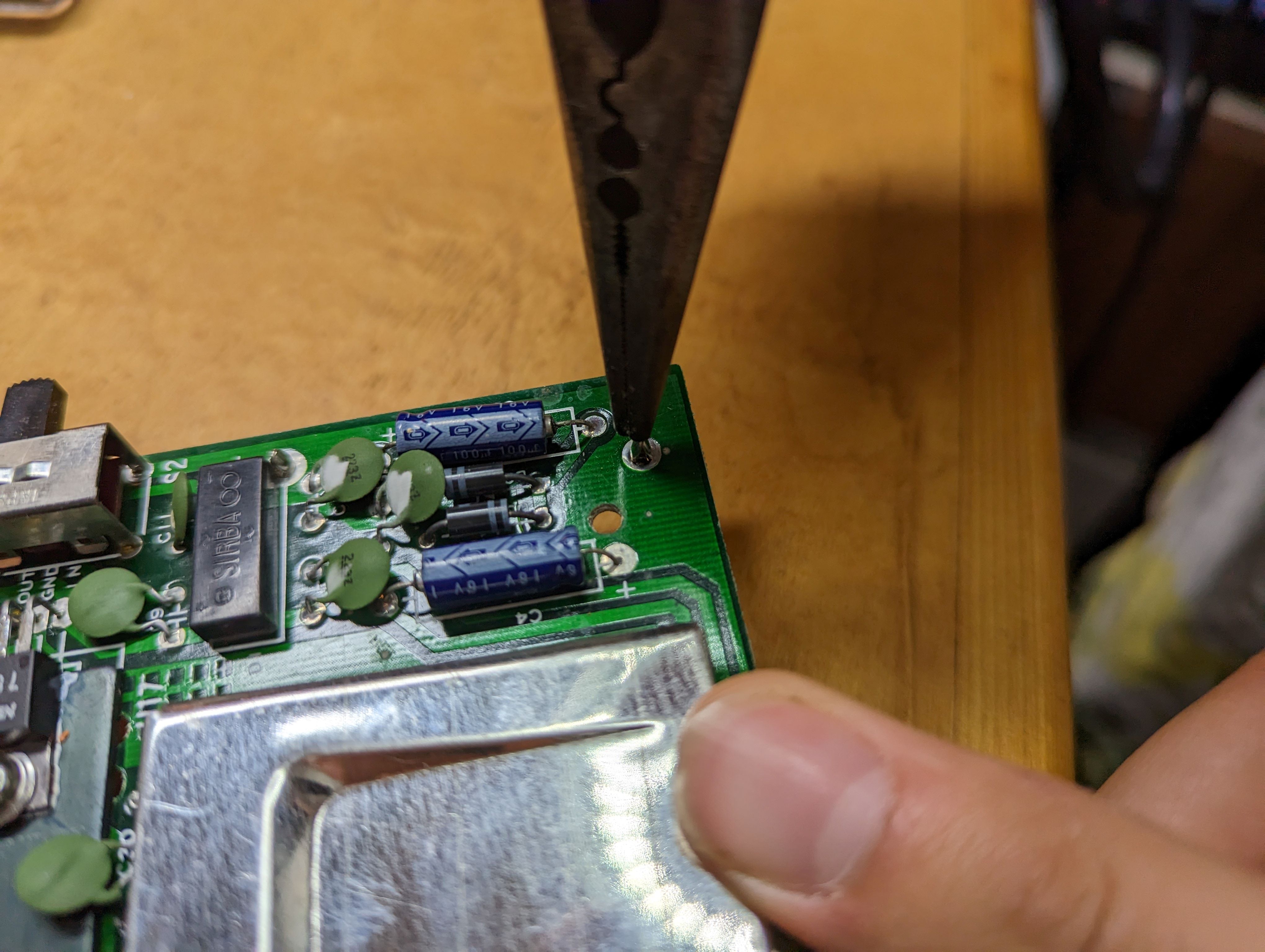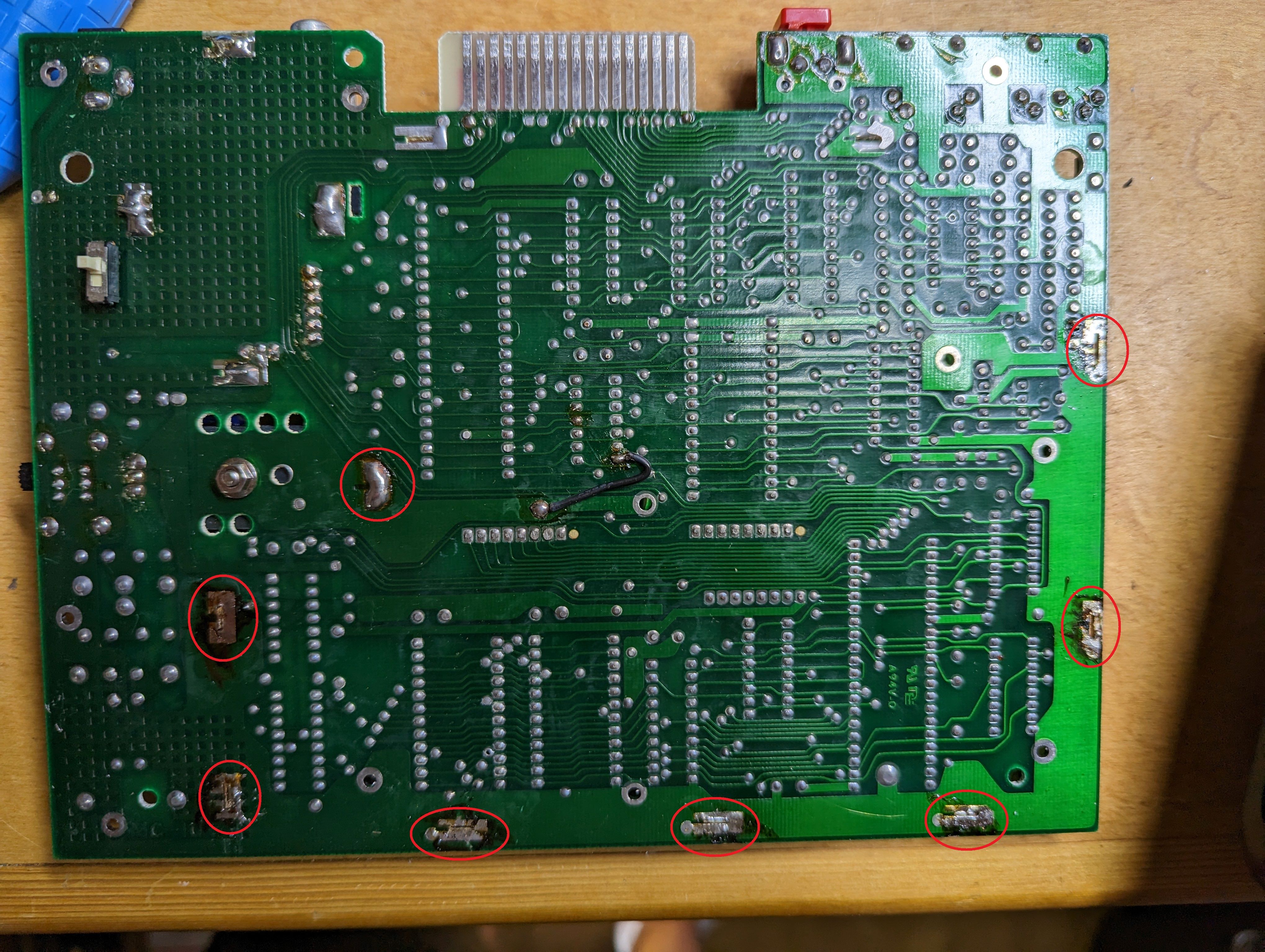 - Identify the locations of 8 solder lugs holding the large metal shield in place on the mainboard. From the bottom of the board, desolder these lugs and remove the shield. A desoldering gun or soldering gun and solder sucker or solderwick work best, but with patience, a solderpen can also do the job. Note that some lugs may be twisted and require rotation using needlenose pliers after they are desoldered in order to get them out through the slots in the circuit board. The metal shield will no longer be needed unless there is desire to reverse the installation in the future.
