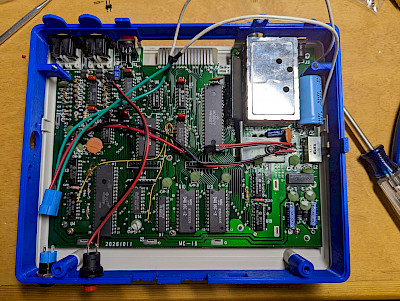 - Plug the PiKey-10 into the MC-10 mainboard either at the original white "guillotine" connectors (if still installed) or the new black 8-pin header connectors. Drop the joystick ports with their trapezoidal metal shields in place into the openings on the 3D-printed riser.